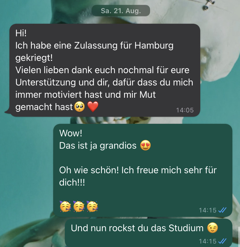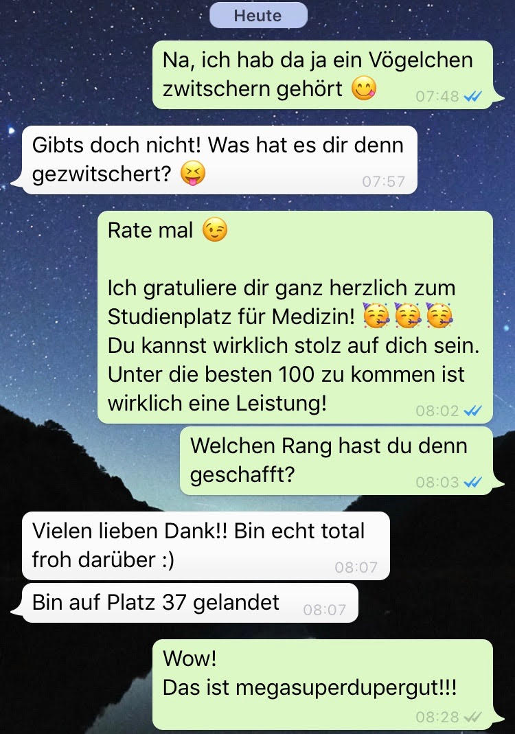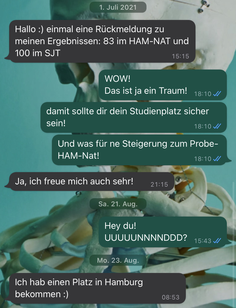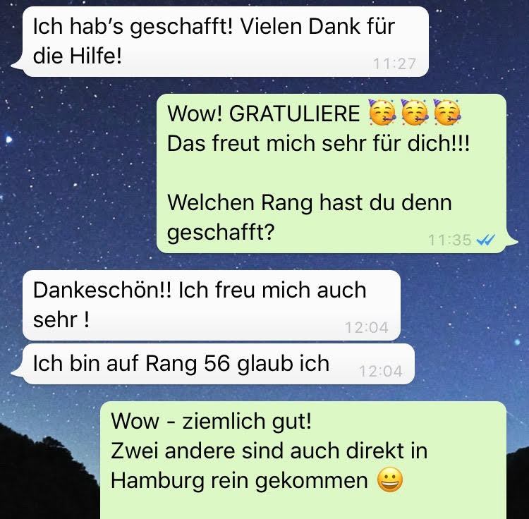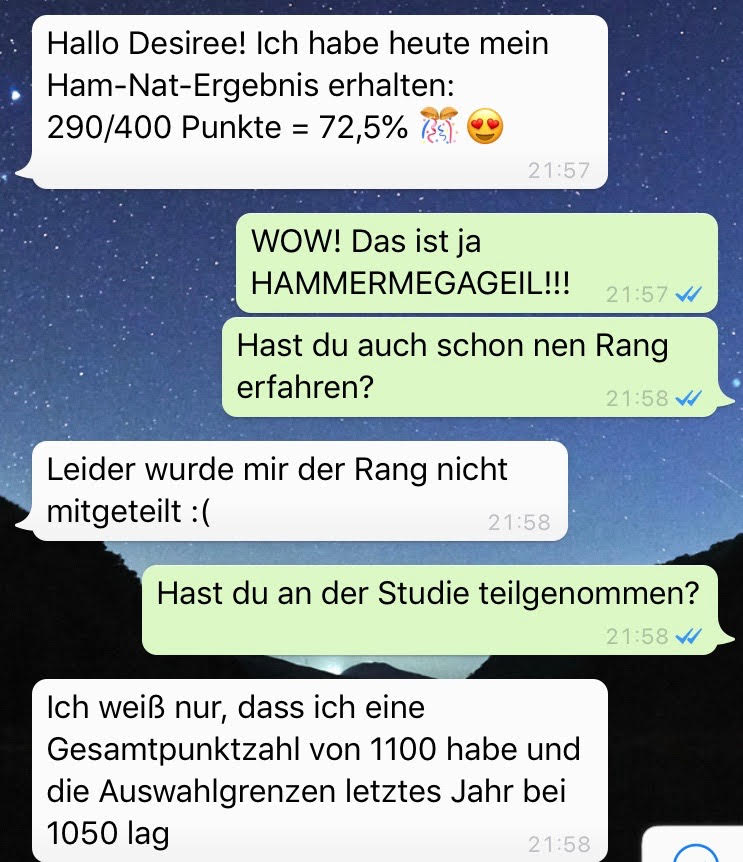 Beachte, dass die Abiturnoten der Teilnehmenden nicht bekannt sind. In den Rückmeldungen steht immer der erreichte Rangplatz anhand der HAM-Nat-Ergebnisse. Damit kann man schon mal grob einschätzen, ob es für einen Studienplatz reichen wird.