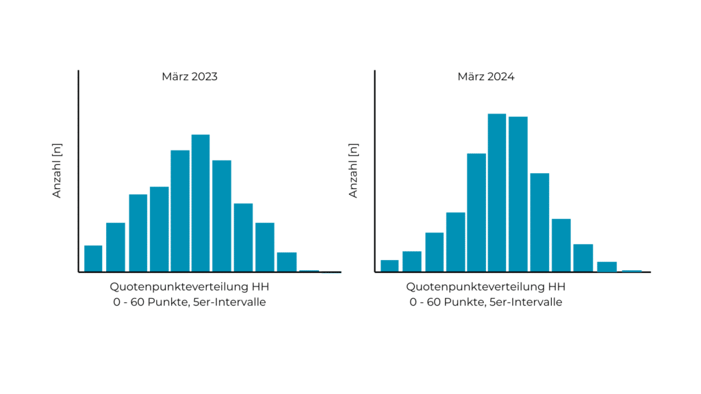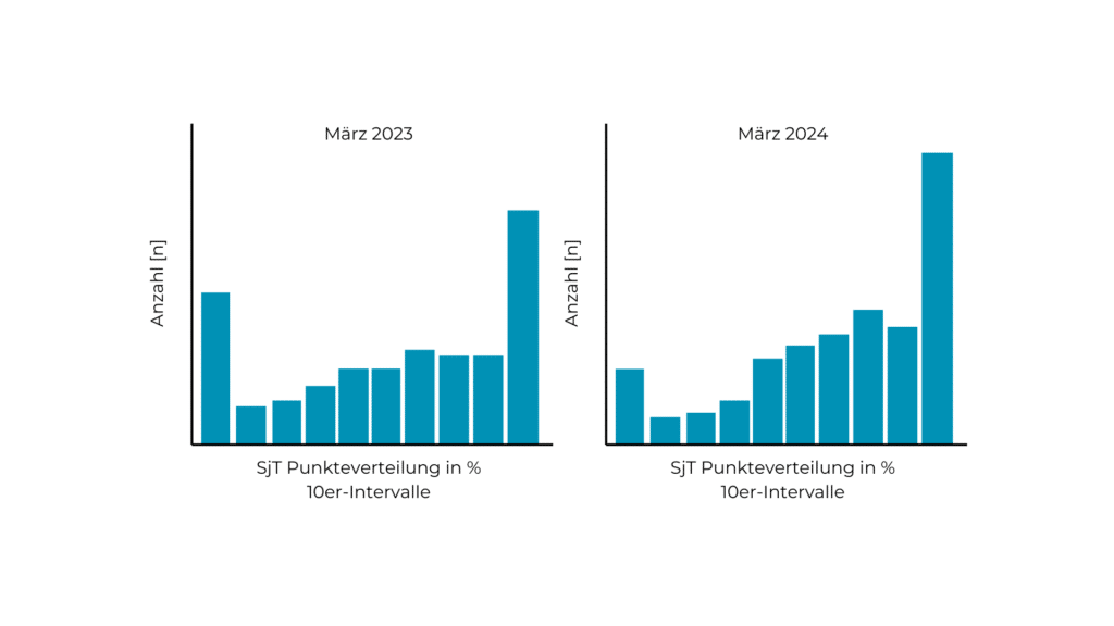 Bis zum Frühjahr 2022 führte ein anderes Verfahren bei der Umrechnung der Abweichungswerte in die Punktzahl (0-100) dazu, dass viele Bewerber*innen die volle Punktzahl von 100 erhielten. Um dem HAM-SJT mehr Einfluss auf die Studienplatzvergabe zu geben, wurde die Umrechnung angepasst, sodass jetzt viele Teilnehmende geringere Punktzahlen für dieselbe Leistung erhalten. Die HAM-SJT-Antworten werden auf einer 4-stufigen Skala mit Expert*innen-Einschätzungen verglichen und in eine Punktzahl von 0 bis 100 umgewandelt. Diese Anpassung sorgt dafür, dass die Testergebnisse ähnlich stark streuen wie die HAM-Nat-Ergebnisse, mit vielen Teilnehmenden bei 100 und 0 Punkten.