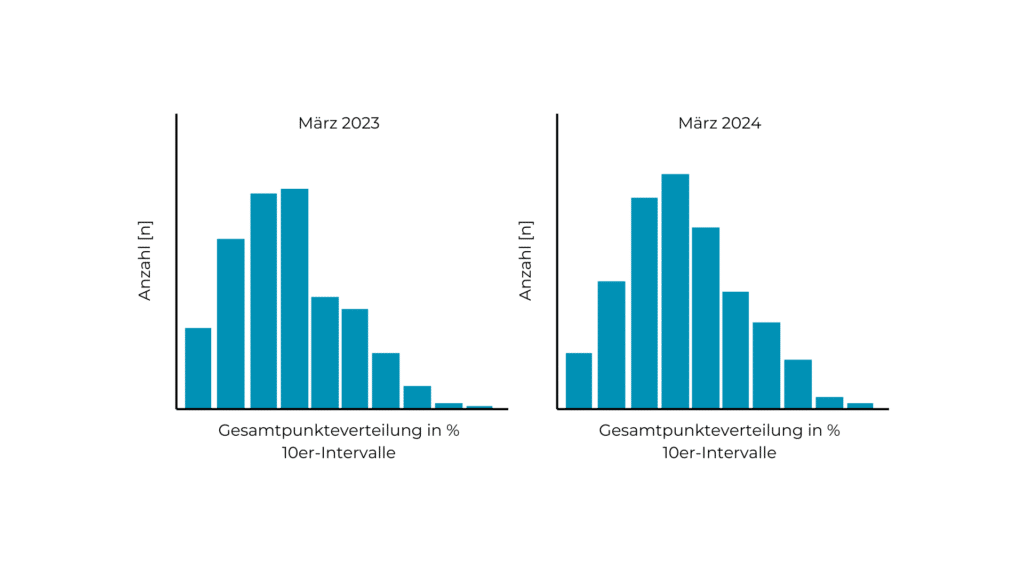 Im März 2023 nahmen knapp 1800 Personen am HAM-Nat teil, im März 2024 waren es etwas mehr als 1900. Die meisten erreichen dabei nur bis zu 59% der Gesamtpunkte (maximal 59 von 100 Punkten). Im September erzielen die Teilnehmer*innen oft noch weniger Punkte, wahrscheinlich weil viele sich nicht vorbereiten und diese Runde als „Probe“ ansehen.